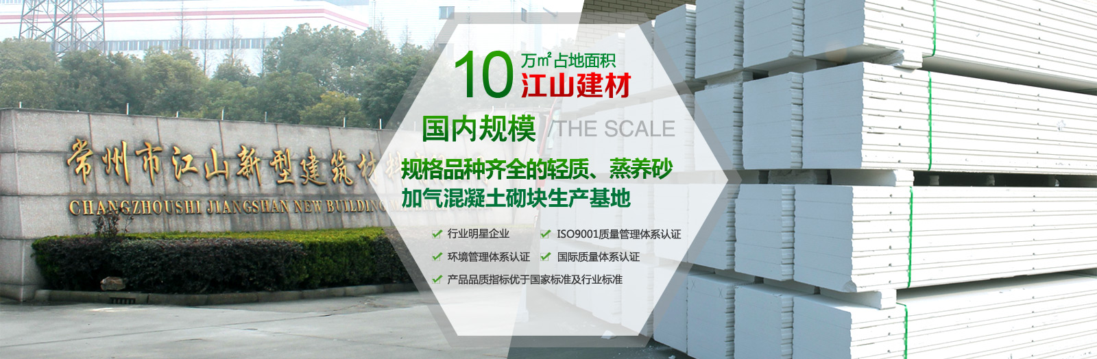 常州市江山新型建筑材料有限公司是江蘇地區AAC(蒸壓砂加氣混凝土)砌塊、板材集研發(fā)、生產、銷售為一體的規(guī)模性企業(yè)。地處長三角經濟帶樞紐—常州市經濟開發(fā)區,距離G42高速出口僅 3公里,交通便利,物流發(fā)達。公司占地13.5萬平方米,現有員工300多人,其中研發(fā)技術人員占比35%,為我們產品的生產研發(fā)提供堅實的保障。公司更配備有專業(yè)的銷售、售后及運輸團隊,致力于為客戶提供^優(yōu)質的服務。公司分兩期總投資3億元人民幣,一期二期已形成80萬方蒸壓砂加氣混凝土砌塊及35萬方蒸壓砂加氣混凝土板材的年產能。